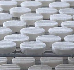C’est une opération où la maîtrise du geste est fondamentale. La pâte est étalée dans les moules pour former les petits palets de Rocamadour. Les palets sont démoulés immédiatement et positionnés sur des grilles d’affinage.